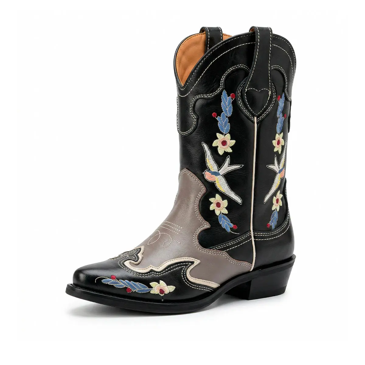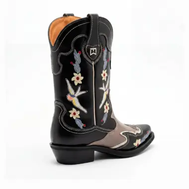 Botas texanas em pele bordadas para mulher Bird Western Friday Mood, com design exclusivo e detalhes coloridos que destacam qualquer look. Confortáveis, resistentes e ideais para estilo boho, urbano ou festival.