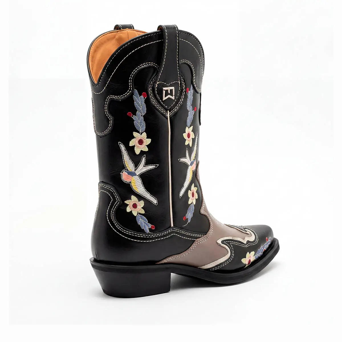As botas texanas em pele bordadas para mulher Bird Western Friday Mood destacam-se pelo seu design único e artístico com inspiração western.
