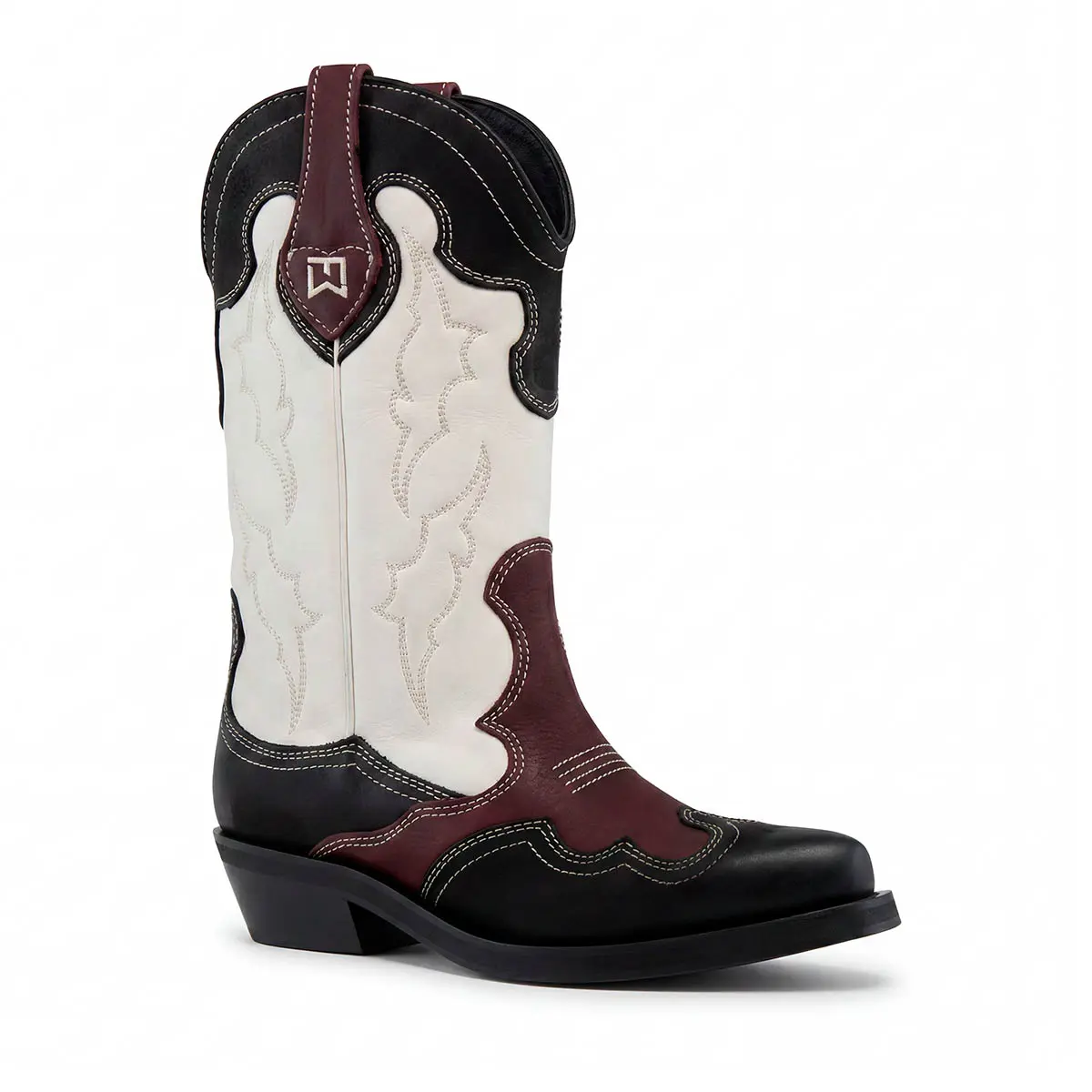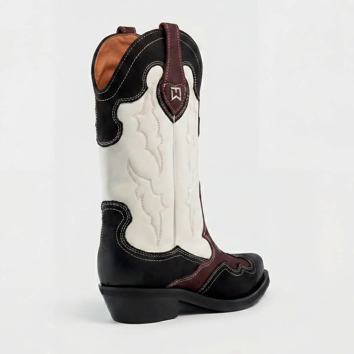 Botas texanas em pele para mulher Bandit Western bicolor Friday Mood, com design marcante e estilo western moderno. Confortáveis, resistentes e ideais para looks urbanos ou festivais, são a escolha perfeita para quem procura botas cowboy femininas premium com personalidade.