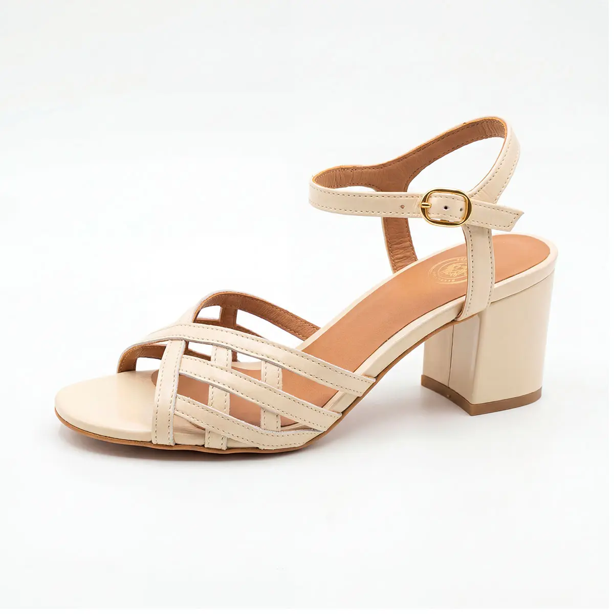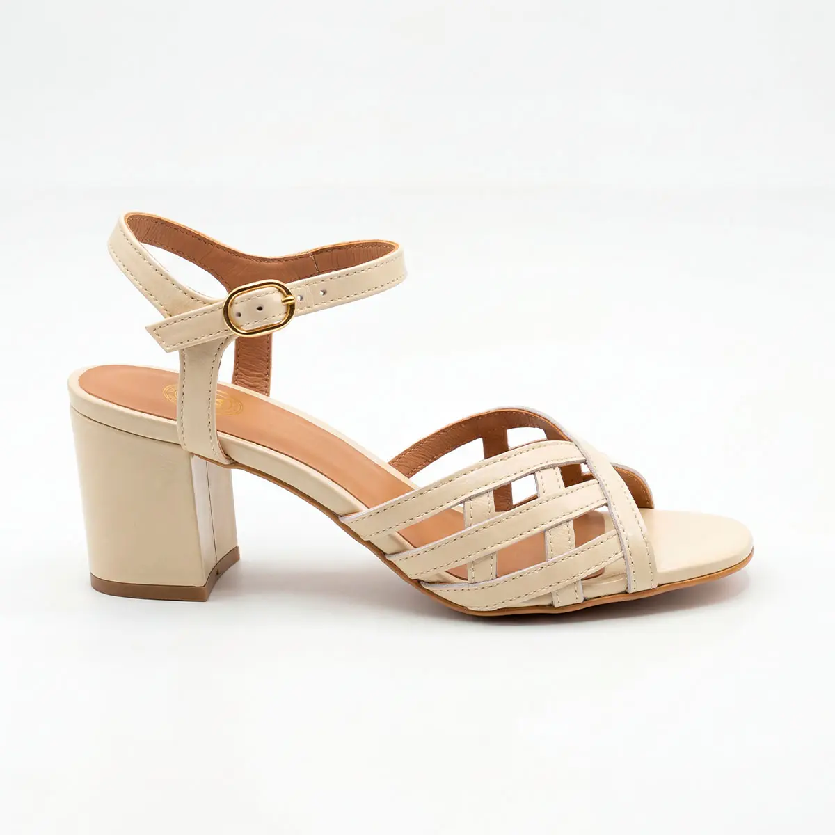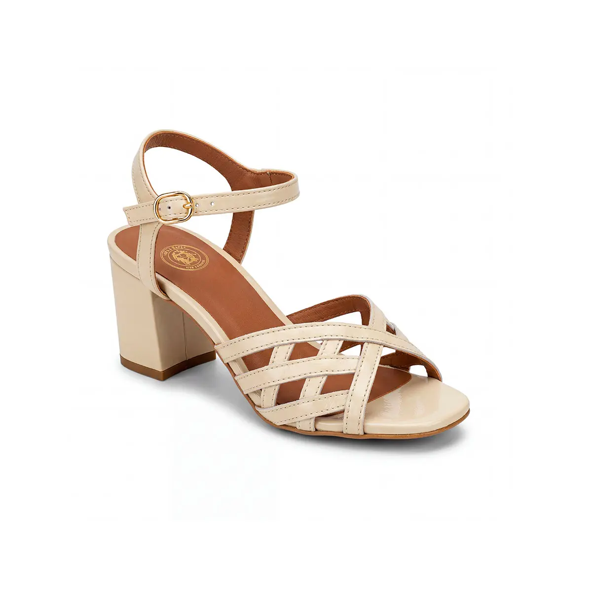 Sandália em pele bege Hupa Shoes com salto bloco de 6 a 7 cm e tiras cruzadas elegantes, perfeita para looks sofisticados e versáteis no dia a dia ou ocasiões especiais.