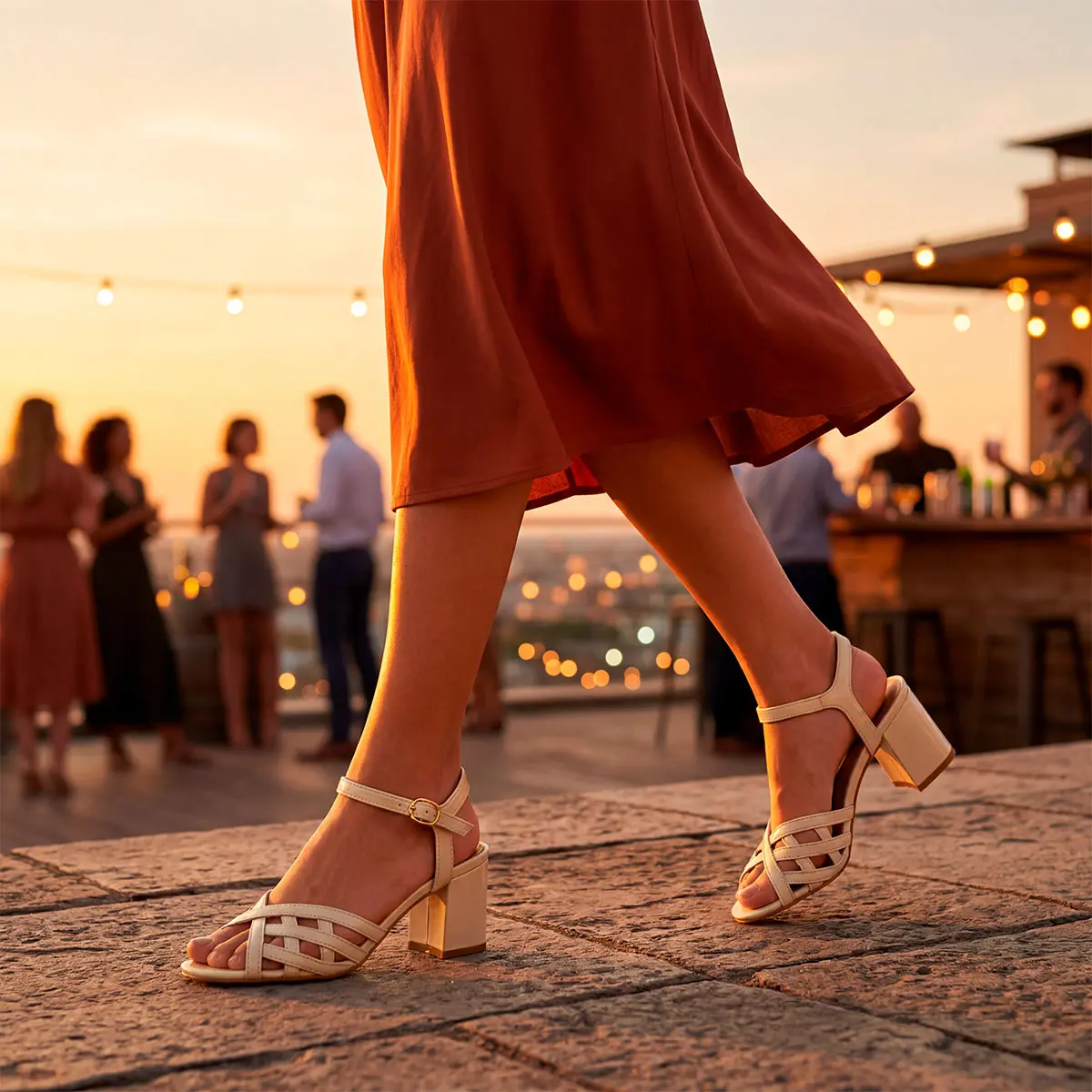 Com salto bloco de aproximadamente 6 a 7 cm, proporciona estabilidade e conforto ao caminhar, sendo ideal para uso prolongado ao longo do dia ou eventos.