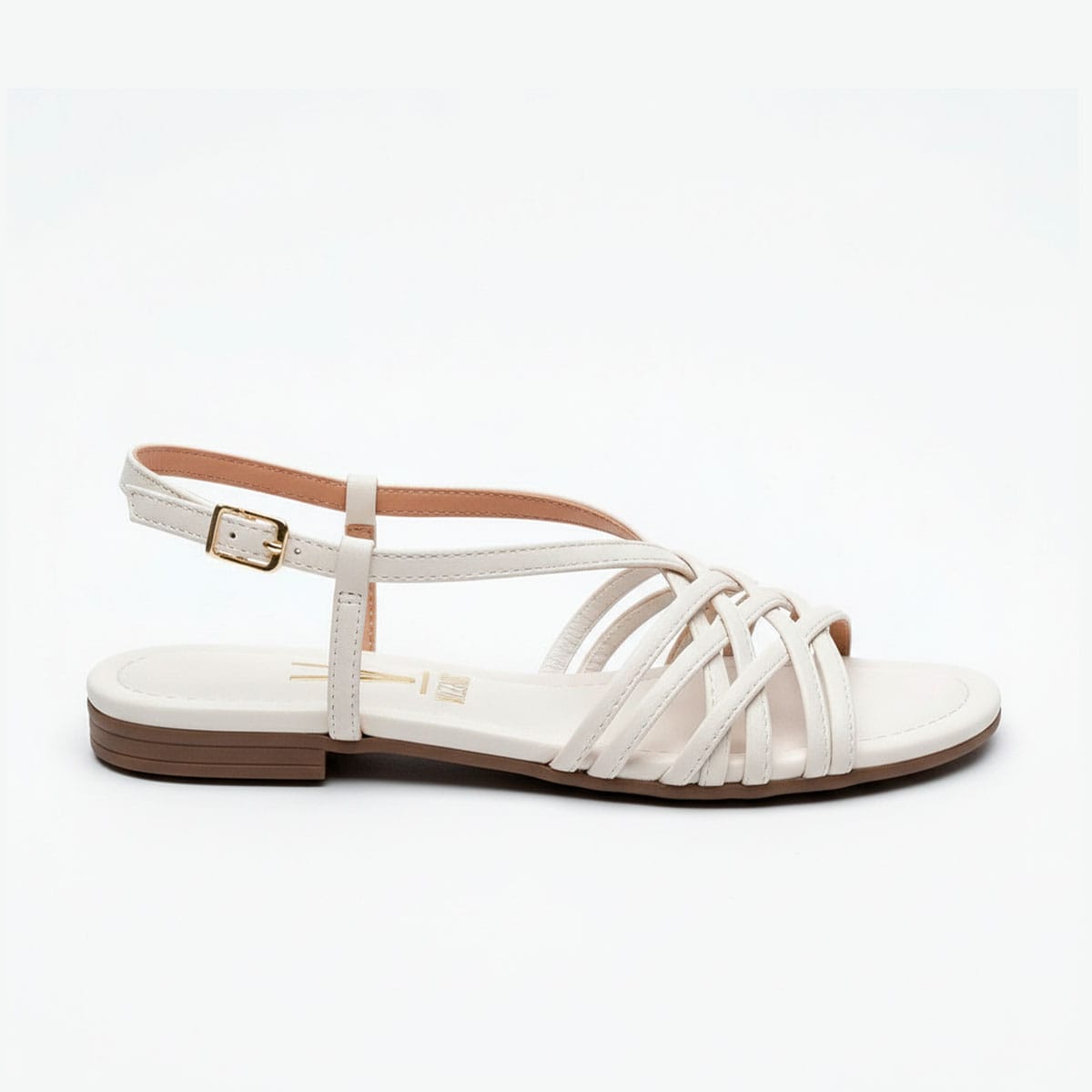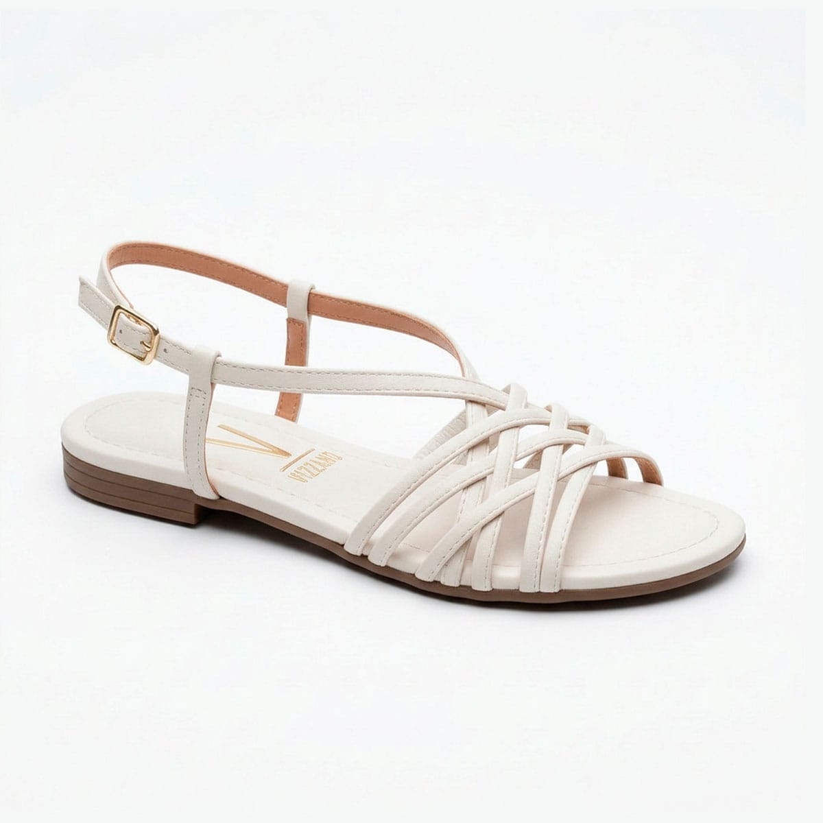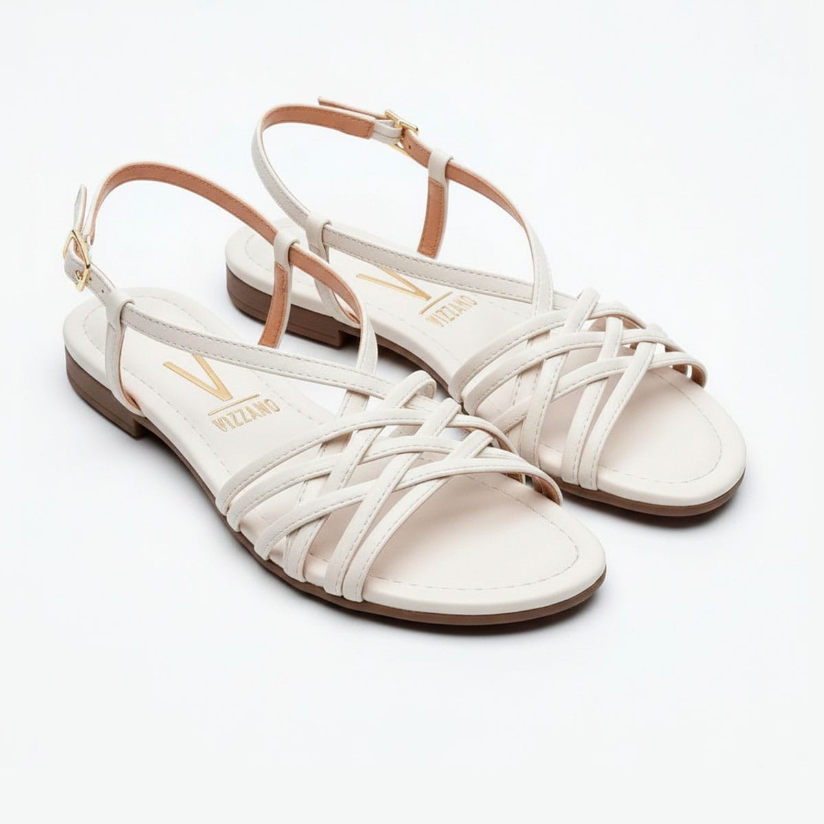 Sandália rasteira de tiras Vizzano branca, elegante e confortável, perfeita para looks frescos e sofisticados de verão. Design leve com ajuste seguro e estilo versátil.