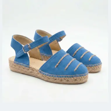 Sandálias alpercatas azuis confortáveis com fivela ajustável e sola em corda. Modelo leve e versátil, ideal para o dia a dia no verão com máximo conforto.