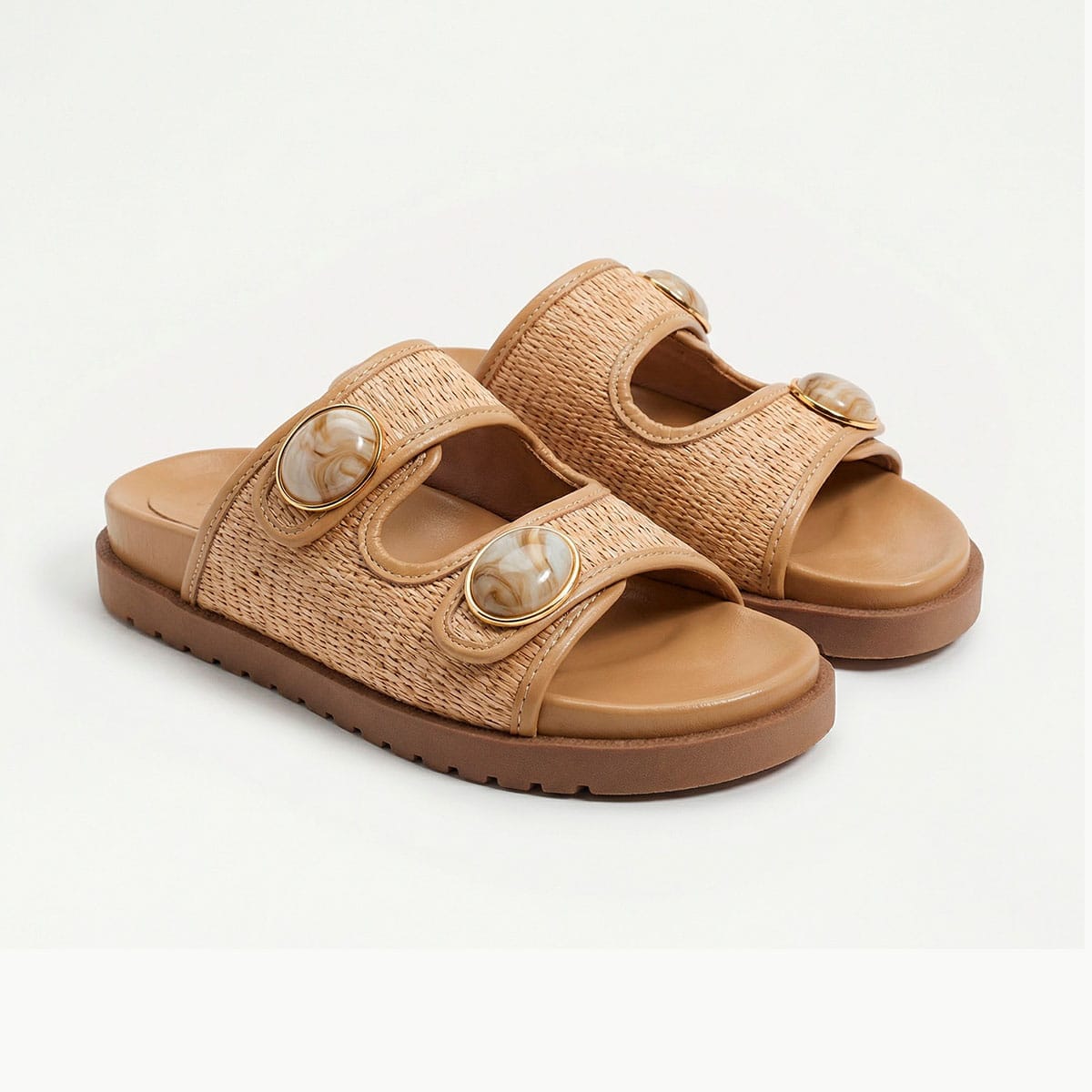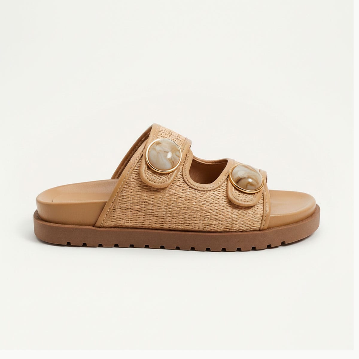 Sandálias senhora em couro natural são a escolha ideal para quem procura conforto e estilo no dia a dia. Este modelo slide destaca-se pelo design moderno e pelas fivelas decorativas, que acrescentam um toque elegante.